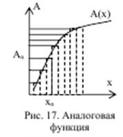 Аналоговой называется такая функция А(х), значение которой изменяется непрерывным образом при непрерывном изменении аргумента х (рис. 17). Большинство физических величин являются непрерывными (например, напряжение U(t)), или принимаются таковыми в теоретической модели. Например ток I(t) физически является потоком дискретного числа частиц – электронов или ионов, но из-за слишком большого количества заряженных частиц, протекающих через проводник в единицу времени, и его случайного изменения ток считается непрерывной величиной. Это означает, что за величину тока мы принимаем некоторое статистически среднее, а среднее случайных дискретных величин само по себе может быть величиной непрерывной.