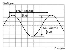 Устройство отображения обычно разграфлено на клетки (или, более официально, деления), что позволяет по изображению входного сигнала оценить параметры входного сигнала (рис. 2). Кроме того, часто на экранах осциллографов между клетками есть штрихи, позволяющие отсчитывать доли деления как по вертикали, так и по горизонтали (например, см. рис. 2). Например, период входного сигнала на рис. 2 равен 6,3 клеткам. Зная масштаб времени по оси X – 10 миллисекунд на деление, получаем период входного сигнала равным 6,3·10=63 мс. Также легко определить полный размах входного сигнала по вертикали – на рис. 2 он равен 50 милливольтам.