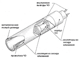 ЧЭ представляет собой платиновую спираль, четыре отрезка которой укладываются в каналы трубки из оксида алюминия и засыпаются мелкодисперсным порошком из оксида алюминия высокой чистоты. Таким образом, обеспечивается изоляция витков спирали друг от друга, амортизация спирали при термическом расширении и вибропрочность. Герметизация концов ЧЭ проводится с помощью цемента, приготовленного на основе оксида алюминия, или специальной глазури.