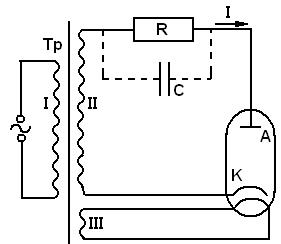 Первичная I обмотка трансформатора Тр соединена с источником переменного тока. Одна из вторичных обмоток III служит для питания нити накала кенотрона. Концы другой вторичной обмотки II присоединены к аноду и катоду кенотрона. В эту цепь включен потребитель выпрямленного тока, сопротивление которого R.