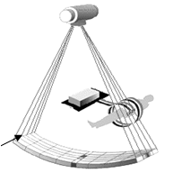 4.1 Принцип КТ заключается в получении серии поперечных срезов исследуемого органа с помощью движущегося вокруг срезов по окружности коллимированного рентгеновского излучения при перемещении исследуемого органа мимо плоскости рентгеновского пучка с последующим построением изображений на основе компьютерных технологий (рис.12) .
