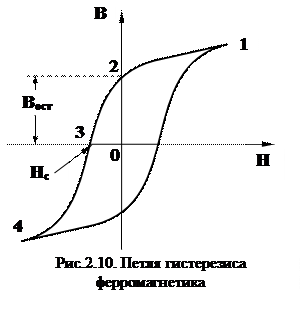 Доведем намагниченность тела до насыщения, повышая напряженность внешнего поля (рис. 2.10, точка 1), а затем будем уменьшать Н. При этом зависимость В(Н) следует не первоначальной кривой 0-1, а новой кривой 1-2. При уменьшении напряженности до нуля намагниченность вещества и магнитная индукция исчезнут. При Н=0 магнитная индукция имеет ненулевое значение Вост, которое называется остаточной индукцией. Намагниченность Jост, соответствующая Вост, называется остаточной намагниченностью, а ферромагнетик приобретает свойства постоянного магнита. Вост и Jост обращаются в нуль лишь под действием поля, противоположного по направлению первоначальному. Значение напряженности поля Нс, при котором остаточные намагниченность и индукция обращаются в нуль, называется коэрцитивной силой(от лат. coercitio - удержание). Продолжая действовать на ферромагнетик переменным магнитным полем, получим кривую 1-2-3-4-1, называемую петлей гистерезиса. В данном случае реакция тела (В или J) как бы отстает от вызывающих ее причин (Н).