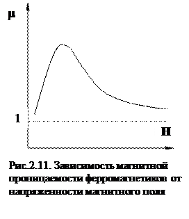 · Существенной особенностью ферромагнетиков являются огромные величины магнитной проницаемости и магнитной восприимчивости. Например, для железа μмах ≈ 5000, для пермаллоя – 100000, для супермаллоя – 900000. Для ферромагнетиков величины магнитной восприимчивости и магнитной проницаемости являются функциями напряженности магнитного поля Н (рис.2.11). С ростом напряженности поля значение μ сначала быстро возрастает до μмах, а затем уменьшается, приближаясь к значению μ=1 в очень сильных полях. Поэтому, хотя формула В = μμ0Н остается справедливой и для ферромагнитных веществ, линейная зависимость между В и Н нарушается.