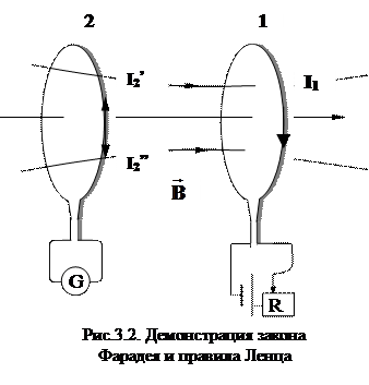 Рассмотрим пример, демонстрирующий данный закон (рис. 3.2). В контуре 1 создается ток силы I1, его можно изменять с помощью реостата R. Этот ток создает магнитное поле, пронизывающее контур 2. Если мы будем увеличивать ток I1, поток Фm магнитной индукции через контур 2 будет, изменяясь, расти. Это приведет к появлению в контуре 2 индукционного тока I2’, регистрируемого гальванометром G и направленного противоположно I1. Если, наоборот, уменьшать I1, то и поток через контур 2 будет уменьшаться, что приведет к появлению в нем индукционного тока I2’’, направленного так же, как I1.