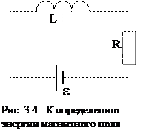 Для определения энергии магнитного поля рассмотрим контур, состоящий из источника э.д.с. - ε, катушки индуктивности - L и сопротивления - R (рис.3.4). При замыкании цепи ток возрастает от 0 до I, и, следовательно, возникает э.д.с. самоиндукции εis, направленная против э.д.с. ε, возбуждающей ток. При размыкании цепи сила тока уменьшается от I до 0, что вызывает появление э.д.с. самоиндукции εis того же направления, что и направление внешней ε. Можно предположить, что на увеличение тока в контуре затрачивается дополнительная работа, идущая на создание энергии магнитного поля. При снижении тока эта энергия выделяется в виде дополнительного джоуль-ленцева тепла.