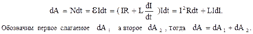 Первое слагаемое dA1 = I2Rdt – это работа, расходуемая на нагревание проводника, т.е. тепло, выделяемое в проводнике за время dt. Второе слагаемое dA2 = LIdI – работа, обусловленная индукционными явлениями. Данная дополнительная работа, затрачиваемая на увеличение силы тока в контуре от 0 до I, находится как интеграл: