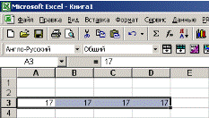 Блок ячеек А3: D3 будет заполнен числами 17 рисунок 22.