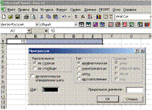 Для этого надо выделить блок ячеек по строке или по столбцу, в первую ячейку блока ввести первое число и выбрать приведенную выше команду. В диалоговом окне Прогрессия выбрать тип прогрессии, шаг и расположение чисел и нажать кнопку ОК рисунок 32.