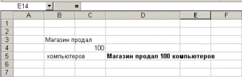 Введем в ячейку В3 текст «Магазин продал », в ячейку В5 – « компьютеров» (в конце первого текста и в начале второго стоят пробелы, чтобы при объединении строки не слипались), в ячейку С4 число 100. Объединим эти данные в ячейке D5, используя оператор сцепления: