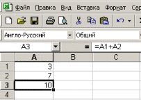 Пусть требуется в ячейку А3 ввести формулу А1+А2. Пусть также в ячейке А1 записано число 3, а в ячейке А2 – число 7. Чтобы ввести формулу в ячейку А3 ее надо выделить (активизировать), набрать