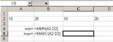 Примеры. 1. Найти минимальное и максимальное значения из чисел, находящихся в блоке ячеек А2:D2 как показано на рисунках 262 – режим показа формул