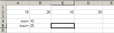 1. Найти минимальное и максимальное значения из чисел, находящихся в блоке ячеек А2:D2 как показано на рисунках 262 – режим показа формул, и 263 – режим вычислений.