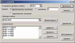 Чтобы принять ограничение и приступить к вводу нового, нажмите кнопку Добавить. Аналогично вводятся и другие ограничения. Чтобы вернуться в диалоговое окно Поиск решения, нажмите кнопку OK.