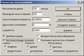 Флажок Линейная модель в диалоговом окне Параметры Поиска решения рисунок 307 позволяет задать любое количество ограничений. Флажок Неотрицательные значения позволит соблюсти условие неотрицательности переменных (при решении нашей задачи – поставить обязательно). Остальные параметры можно оставить без изменений, либо установить нужные для вас параметры, при необходимости используя справку.