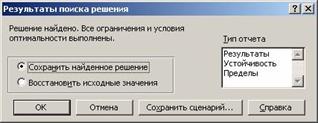 - чтобы сохранить найденное решение на листе, выберите в диалоговом окне Результаты поиска решения вариант Сохранить найденное решение рисунок 308;