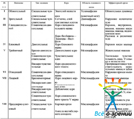 Исходя из задач настоящей работы, мы не будем подробно останавливаться в этом разделе на всех черепных нервах. Опишем лишь нервы, имеющие наибольшее значение в иннервации глазного яблока и окружающих его структур. Тем не менее мы считаем целесообразным привести сводную таблицу, характеризующую все черепно-мозговые нервы (табл. 4.3.1),