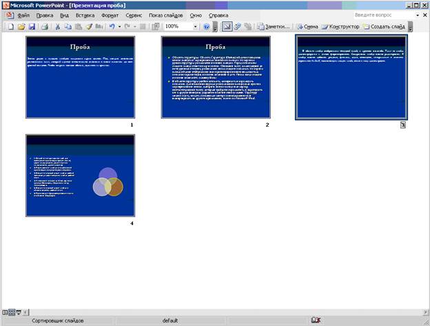 В режиме сортировщика слайдов (Slide Sorter) на экране отображаются небольшие миниатюры всех слайдов презентации сразу, а вокруг просматриваемого слайда видна рамка темного цвета. Вид окна PowerPoint в режиме сортировщика слайдов приведен на рисунке 5.