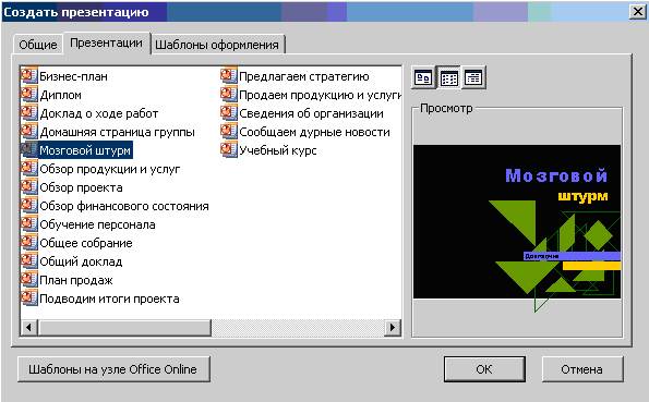 На вкладке Презентация (Presentation) представлены шаблоны, которые используются Мастером автосодержания (AutoContent Wizard), как показано на рисунке 10.