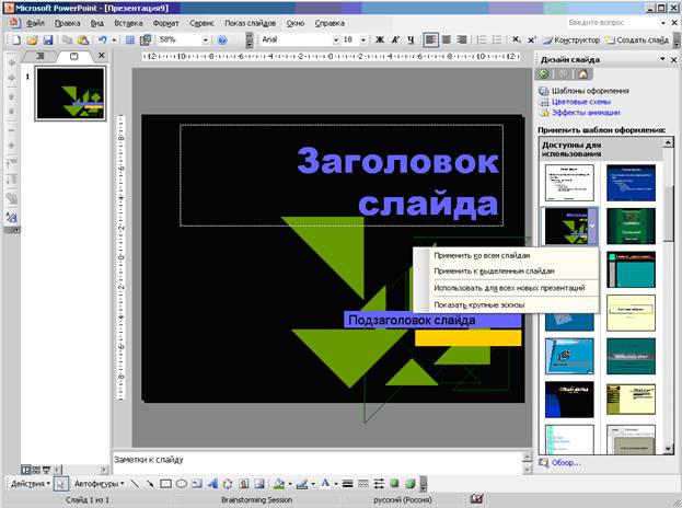 Для создания презентации из шаблона оформления на панели инструментов Форматирование (Formatting) нажмите кнопку Конструктор (Design) или в меню Формат (Format) выберите команду Оформление слайда (Slide Design). В окне PowerPoint, пример которого приведен на рисунке 11, отобразится область задач Дизайн слайда (Slide Design)
