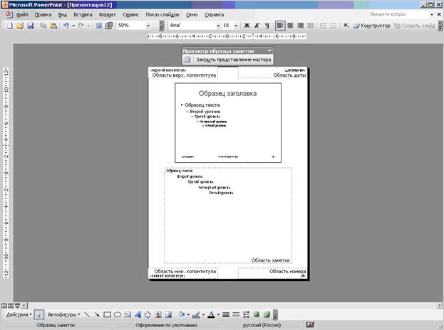 В верхней части образца заметок показано уменьшенное изображение образца слайдов. Внесите требуемые изменения, например, измените размеры и расположение слайда или поля заметок, измените шрифт, цвет и размер текста, знак маркера, добавьте рисунок или надпись. Эти изменения будут отображены на всех страницах при печати слайдов с заметками, как показано на рисунке 18.