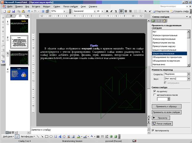 После установки в нижней части области задач флажка Автопросмотр (AutoPreview) можно просмотреть выбранный эффект в режимах Обычный и Сортировщик слайдов.
