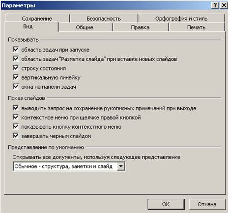 Настройка вида окна PowerPoint, возможностей редактирования, сохранения и печати презентаций выполняется на вкладках диалогового окна, отображаемого после выбора команды Параметры (Options)в меню Сервис (Tools).