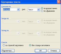 Поля как части абзаца разделяются - табуляцией, запятыми или др. символами. Сортировать можно по трем полям в списках Затем по. Затем выбирается для сортировки Тип, По возрастанию (убыванию). Со строкой заголовка или без. Кроме того, можно задать некоторые параметры (лаб. раб.)