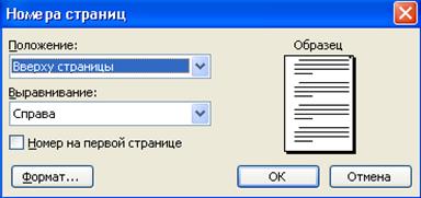 1. выполнить команду Вставка / Номера страниц. Открывается окно диалога Номера страниц изображенного на рисунке 25;