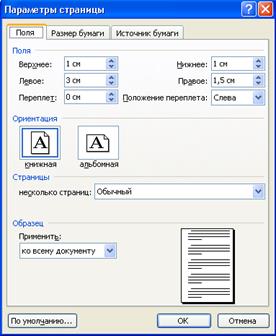 2. выполнить команду Файл / Параметры страницы. В окне диалога Параметры страницы изображенной на рисунке 27 три вкладки: Поля, Размер бумаги, Источник бумаги;
