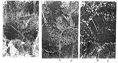 Рис.3.5 Заэвтектоидная сталь(травление 4%-ным спиртовым раствором азотной кислоты): а-выделение избыточного цементита в виде зерен (х 600),б-выделенин избыточного цементита в виде сетки(х200),в- выделение избыточного цементита в виде (х660).