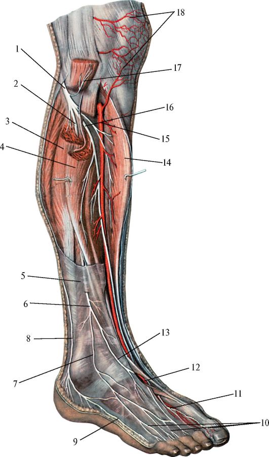 1 - общий малоберцовый нерв, 2 - поверхностный малоберцовый нерв, 3 - длинная малоберцовая мышца, 4 - длинный разгибатель пальцев, 5 - фасция голени, 6 - поверхностный малоберцовый нерв, 7 - промежуточный тыльный кожный нерв, 8 - икроножный нерв, 9 - латеральный тыльный кожный нерв, 10 - тыльные пальцевые нервы стопы, 11 - глубокий малоберцовый нерв, 12 - тыльная артерия стопы, 13 - медиальный тыльный кожный нерв, 14 - передняя большеберцовая мышца, 15 - передняя большеберцовая артерия, 16 - глубокий малоберцовый нерв, 17 - мышечные ветви, 18 - коленная суставная сеть.