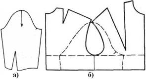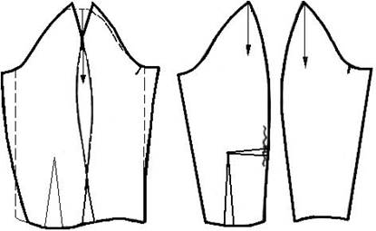 На спинке и полочке проводят линии проймы, отрезанные части полочки и спинки надрезают через равные промежутки и, соединяя с выкройкой рукава (манто), обрисовывают новую форму (рис.4,б). Для того чтобы добиться хорошей посадки рукава и его соответствия модели, желательно проверить полученную форму на макете.