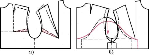 «Манто» — покрой одежды с замкнутыми, сильно увеличенными проймами. В этом покрое увеличен припуск по линии груди, плечо спущено и удлинено, пройма расширена и углублена. Припуск к обхвату руки 12-20см. Припуск на свободу проймы 6-16см. Для построения выкройки изделия покроя «манто» в выкройке - основе прежде всего, нужно расширить лиф и уменьшить или убрать вытачку. Лиф расширяют, увеличивая припуск на свободу облегания, распределяя его по частям: 0,1— на полочку, 0,2— на спинку и 0,7 величины припуска в боковые швы. Расширение выкройки в основных швах может быть проведено по всей длине, но обычно его уменьшают к линии талии или линии бедер в зависимости от модели. Чем больше величина припуска на свободу облегания по линии груди, тем меньше необходимость в вытачке. В изделиях небольших размеров (до 48) при припуске, равном 10см, необходимость в вытачке отпадает. Уменьшение раствора вытачки производят путем частичного или полного перевода ее в пройму (рис.3,а).