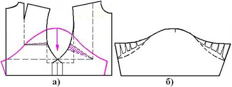 При этом длина проймы увеличивается. На выкройке спинки в пройму можно перевести часть плечевой вытачки, оставив на посадку 1-1,5см. Длина линии плеча увеличивается по желанию, при этом линия проймы спрямляется. Глубину проймы увеличивают (рис.3,б), опуская верхнюю точку бокового шва (аналогично построению проймы рукава покроя «сак»). Конструкцию рукава изменяют в соответствии с изменением проймы, т. е. расширяют, раздвигая выкройку посередине и добавляя к локтевому и переднему срезам. Верхнюю часть оката срезают (обычно на величину удлинения плеча). Оформляется окат плавной изогнутой линией. При припуске на свободу проймы больше 6см высота оката не соответствует глубине проймы. Припуск на посадку оката рукава при высоте его от 6 до 10см равен 0,5-1,5см, если высота оката больше 10см, припуск увеличивают.