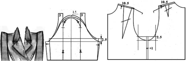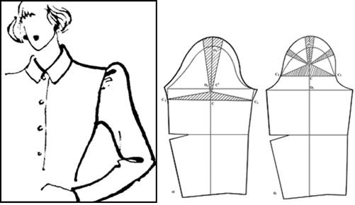 Рукав-пагода. Для рукавов с окатом такого типа требуется кроткая линия плеча в изделии, так как часть проймы переда и спинки переносится на окат рукава (рис.14). Величина укорачивания плеча – 1,5см; величина уменьшения оката – 1,5см.