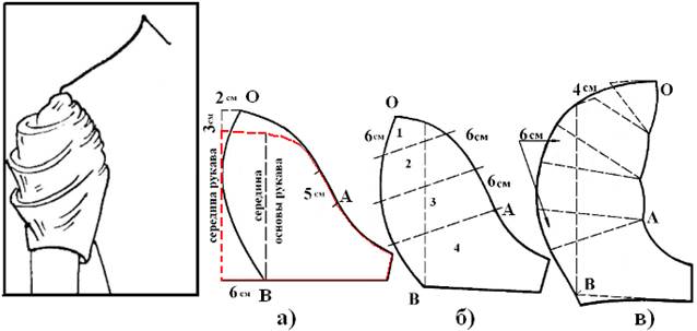 Переведите на лист бумаги отдельно обе части рукава. В каждую часть рукава внесите следующие изменения: в соответствии с величинами, данными на рисунке 13,а, проведите, начиная от нижнего конца середины основы рукава, выпуклую линию среднего шва рукава от точки В доточки О (рис.13,б). Начиная от точки О проведите новую линию оката рукава. Поставьте новую точку А на 5см ниже контрольной. Определите длину участка со сборками в готовом виде (например, 24см, т. е. от одной точки А додругой должно быть 24см). Проведите направление складок-драпировок, как показано на рисунке 13,б, откладывая от надсечек О и А по 6см. Пронумеруйте полосы. Переведите чертеж на другой лист бумаги, прибавьте необходимое расширение (см. величины расширения на рис.13,в). Уточните около точки О линию середины рукава, затем измените ее кривизну у полосы 4 (сплошная линия). Отклоните линию низа рукава не перпендикулярно линии середины рукава. Желательно, чтобы линии середины рукава были равной длины на обеих частях рукава. В случае необходимости уменьшите величину расширения.