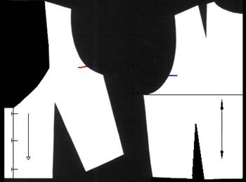Детали кроя полочки/спинки.Вырезать детали полочки и спинки. Наметить место расположения петель для пуговиц. Указать направление нити основы (рис.4).