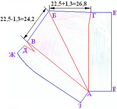 7. Из точки Б проведите дугу, радиусом равным величине отрезка ВБ минус половина раствора вытачки: 25.5-1.3=24.2см.