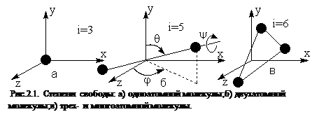 Для дальнейших рассуждений нам понадобится понятие числа степеней свободы – это число независимых переменных (координат), полностью определяющих положение системы в пространстве. Например, молекулу одноатомного газа можно рассматривать как материальную точку, обладающую тремя степенями свободы поступательного движения (координаты x,y,z) (рис.2.1. а). Молекула двухатомного газа, рассматриваемая в классической механике как совокупность двух материальных точек, жестко связанных между собой, имеет уже 5 степеней свободы. У нее имеется 3 степени свободы поступательного движения центра масс и 2 степени вращательного, связанного с поворотами на углы q и j (рис. 2.1. б). Эти углы ‑ полярный угол θ и азимутальный угол φ, определяют ориентацию оси молекулы. В данном случае, на первый взгляд кажется, что необходимо также задавать угол поворота ψ молекулы относительно собственной оси. Но вращение двухатомной молекулы вокруг своей собственной оси ничего не меняет в положении молекулы, так как структуры у материальных точек‑атомов нет и, поэтому, этот угол не нужен для задания положения такой молекулы в пространстве. Трехатомные молекулы (рис. 2.1.в), в которых атомы связаны жестко между собой, имеют 6 степеней свободы, так как здесь уже необходим дополнительный угол ψ.