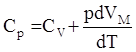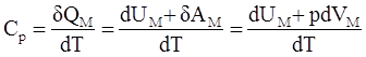 Найдем молярную теплоемкость системы в изобарном процессе, для этого возьмем один моль газа и сообщим ему количество теплоты δQМ. Согласно определению молярной теплоемкости и первому началу термодинамики можем