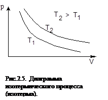 (рис.2.5.), расположенную на диаграмме тем выше, чем выше температура, при которой происходит процесс. Так как при Т = const внутренняя энергия идеального газа не изменяется, то dU = 0 и первое начало термодинамики для изотермического процесса примет вид: δQ = δА. Теплоемкость при изотермическом процессе СТ =δQ/dT=δQ/0 = ∞ и не имеет смысла. Изотермический процесс осуществляется при наличии термостата (внешней среды или тела с большим запасом внутренней энергии, находящемся при той же температуре).