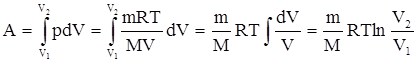 Найдем работу изотермического расширения газа, учитывая, что все количество теплоты, сообщаемое газу, расходуется на совершение им работы против внешних сил и не изменяет его температуру. Учитывая формулу для работы и уравнение Менделеева-Клайперона, получаем