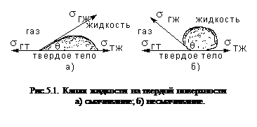 Поверхностное натяжение свойственно не только жидкостям, но и твердым телам. В общем же случае поверхностное натяжение на границе двух сред 1 и 2 следует характеризовать величиной σ12, зависящей от свойств обеих сред. Если граничат друг с другом три различных вещества: твердое, жидкое и газообразное (рис.5.1), то система принимает конфигурацию, соответствующую минимуму поверхностной энергии. При этом равновесие для контура, ограничивающего жидкость на твердом теле, имеет место при выполнении условия σтг= σтж+ σжгcosθ, где σтг, σтж и σжг – поверхностные натяжения на границах: твердое тело – газ, твердое тело – жидкость и жидкость – газ.