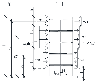 Нормативное значение пульсационной составляющей ветровой нагрузки зависит от частоты собственных колебаний здания. Для принятых в курсовом проекте конструктивных схем зданий с несущими системами в виде вертикальных и горизонтальных диафрагм, собственная частота колебаний будет определяться, как для консолей, защемленных в фундаменте. При отсутствии в задании к курсовому проекту данных к определению изгибной жесткости диафрагм, допускается пульсирующую составляющую ветровой нагрузки определять упрощенно: