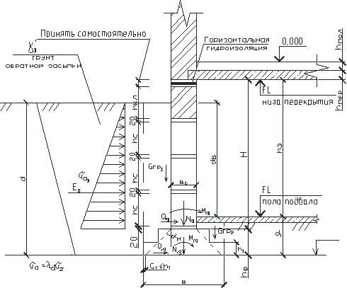 Рис. 5.7 Схема к определению нагрузок на ленточный фундамент в здании с подвалом
