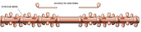 Рис. 3. Толстая нить миофибрилл и образующая её молекула миозина.