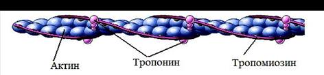 Тропомиозин – еще один компонент тонких нитей. Его молекула представляет собой тяж образованный двумя переплетающимися a-спиральными полипептидными цепями. Тропомиозин связан с F-актином и каждая его молекула прикрывает семь G-актиновых глобул. Соседние молекулы тропомиозина немного перекрываются между собой, так что образуется непрерывная тропомиозиновая цепь, идущая вдоль F-актинового волокна отделяющая его от головок миозина.