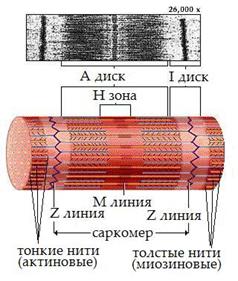 Миофибриллам свойственна поперечная исчерченность — чередование темных и светлых полос. Границы и периодичность полос в миофибриллах одного волокна совпадают, что создает поперечную исчерченность мышечного волокна, обусловленную строго упорядоченным расположением актиновых и миозиновых филаментов (рис. 5).