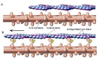 Соединение головки миозина с актином, который активирует АТФ-азную активность миозина, приводит к резкому изменению конформации мостиков и перемещению (скольжению) нити актина вдоль нити миозина (Рис 7Б). Эта процедура осуществляется за счет энергии АТФ.