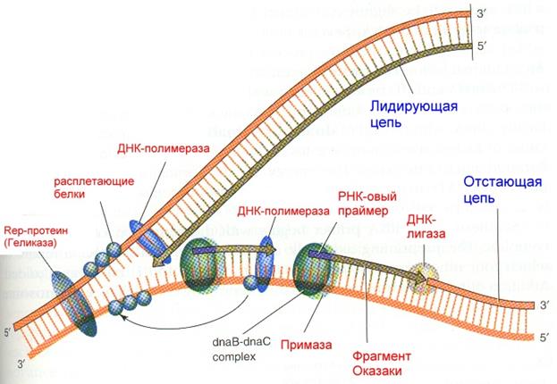 Так как цепи ДНК в дуплексе антипараллельны, то очевидно, что направление расплетания двойной спирали при репликации совпадает с направлением синтеза ДНК лишь для одной матричной цепи, но противоположно направлению синтеза ДНК на комплементарной матрице (рис. 4). Это значит, что лишь на одной из матричных цепей синтез ДНК может происходить непрерывно. Показано, что ДНК синтезируется сравнительно короткими фрагментами, называемыми фрагментами Оказаки. Таким образом, синтез ДНК на двух матричных цепях исходной молекулы заметно различается. Новосинтезированная цепь, которая синтезируется непрерывно, называется ведущей(англ, leading), другая цепь называется запаздывающей(англ, lagging). Каждый фрагмент Оказаки имеет на 5'-конце несколько рибонуклеоти-дов — результат действия праймазы. Характерный размер фрагментов Оказаки различается для бактерий и эукариот: у бактерий они имеют длину около 1000 нуклеотидов, у эукариот они короче, порядка 100 нуклеотидов. Через некоторое время после синтеза РНК-затравки удаляются, бреши застраиваются ДНК-полимеразой, а фрагменты сшиваются в одну ковалентно-непрерывную цепь ДНК предназначенным специально для этого ферментом, ДНК-лигазой. ДНК-лигазы обнаружены у самых разных организмов. Они нуждаются в высокоэнергетических кофакторах.